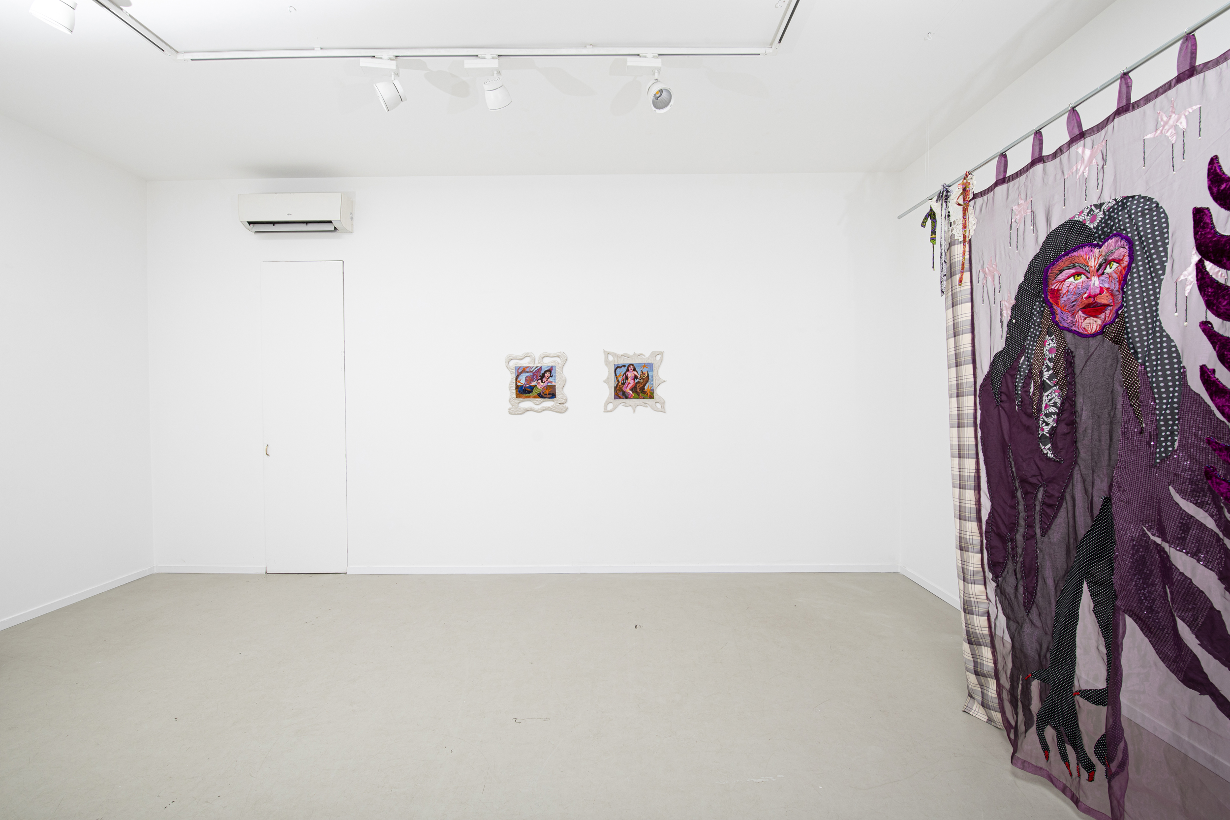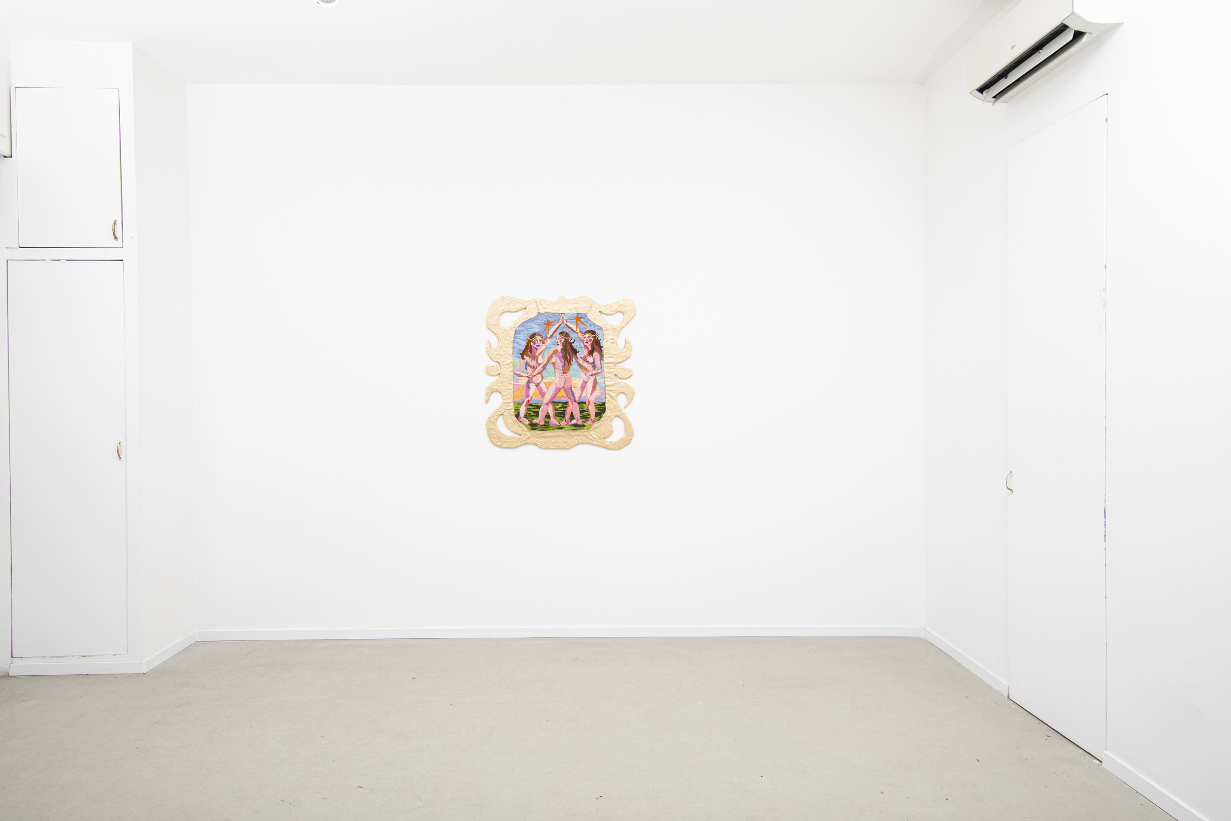 In this exhibition Dankó’s textile works are exclusively populated by female figures who travel from mythology into the present. They appear within well-known art historical and cultural scenarios, yet their presence delicately reaches beyond these inherited frameworks. They move through continuous states of becoming. Women overtaking masculine roles, human bodies gladly evolving into animals as their femininity intensifies, remaining open to further metamorphosis meanwhile rejecting the idea of the human as the highest evolutionary form.