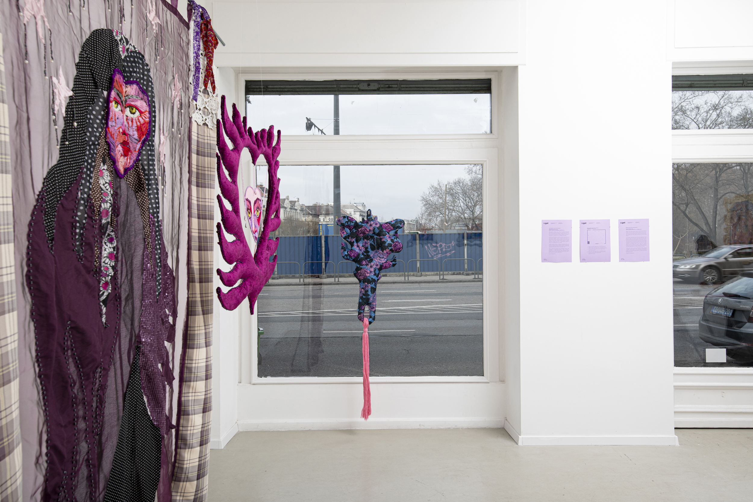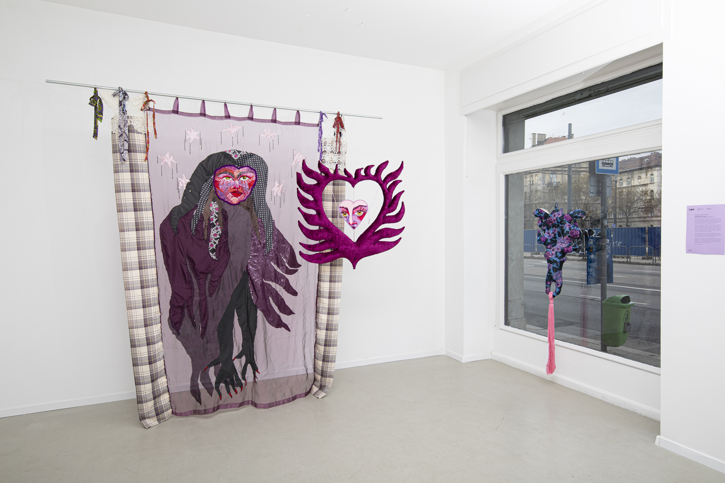 Boglárka Dankó’s figures emerge from under the watchful eye of the Mother of the Night, a large textile installation depicting a witch becoming a crow. They all arrive from a nocturnal realm, a time in which bodies loosen their borders, identities drift and transformation becomes possible. A temporal and symbolic space associated with women, secrecy, care and forms of life that resist discipline.